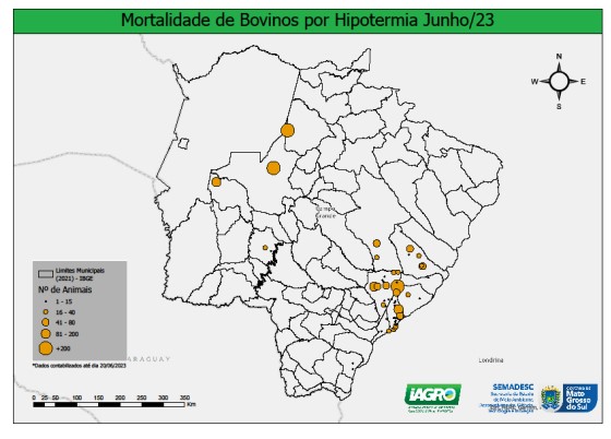 Abaixo temos um mapa demonstrando os municípios nos quais foram notificados casos de hipotermia de acordo com a quantidade de animais mortos até dia 19 de junho de 2023.