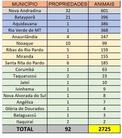 Já com relação a quantidade de animais mortos por município, Nova Andradina (578 animais) teve a maior quantidade de animais mortos seguido de Batayporã (396 animais), Aquidauana (386 animais) e Rio Verde de MT (368 animais), conforme tabela abaixo.