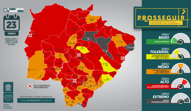 Na bandeira cinza, que orienta apenas o funcionamento de atividades listadas como essenciais no Prosseguir, estão os municípios de Água Clara, Aparecida Do Taboado, Camapuã e Japorã.