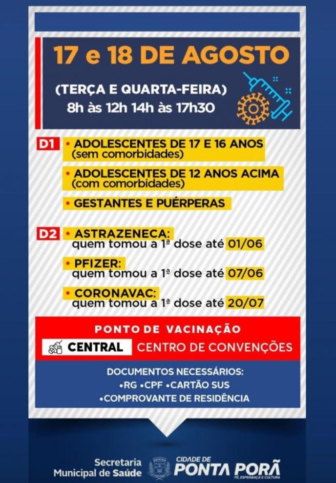 Nesta terça (17), e quarta-feira (18), tem aplicação da D1 (Dose 1) da vacina contra a Covid-19 para adolescentes com mais de 12 anos, e comorbidades. O atendimento é das 8h às 12h, e das 14h às 17h30, no Centro de Convenções.