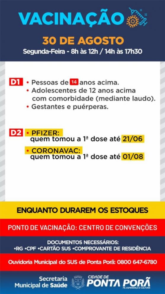O horário de vacinação vai até às 17h30, no Centro de Convenções, porém a assessoria de comunicação ressalta que a imunização segue enquanto durarem os estoques.