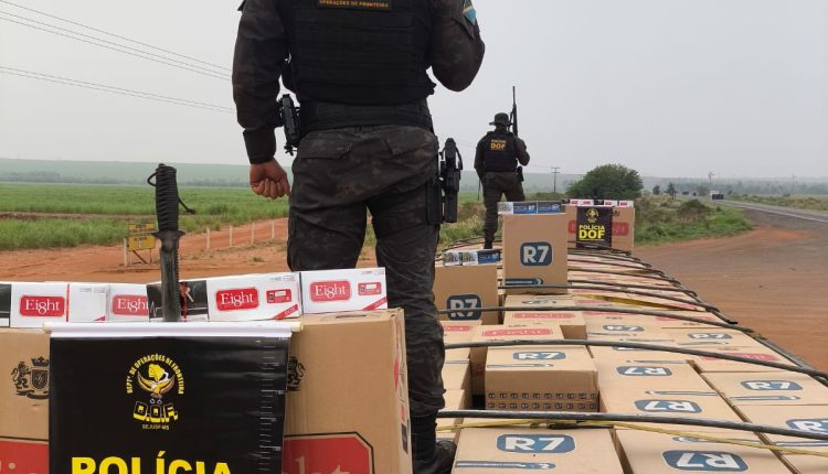 Policiais do DOF (Departamento de Operações de Fronteira) apreenderam na manhã desta terça-feira (8), em Itaquiraí, uma carreta Iveco Stralis carregada com 50 mil pacotes de cigarros contrabandeados do Paraguai. Os policiais realizavam patrulhamento na região do Assentamento Santo Antônio, zona rural do município, quando visualizaram o veículo abandonado às margens da via.