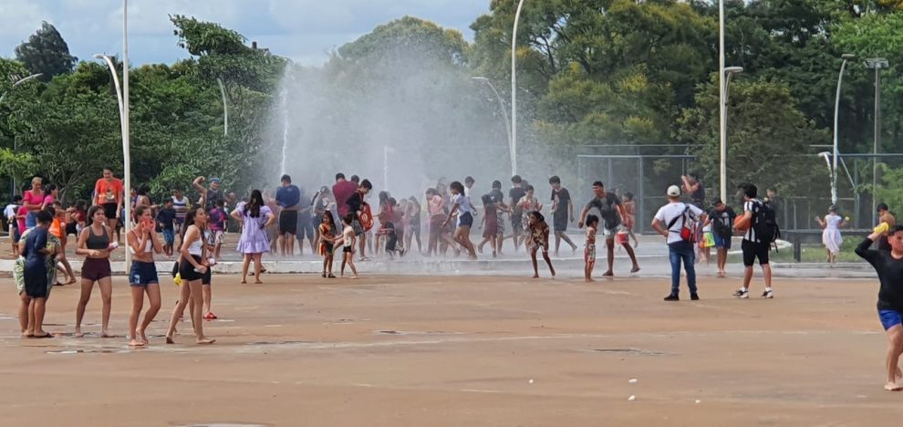 Muita gente grande e pequena aproveitou a tarde quente para se refrescar no chafariz do Parque dos Ervais. A pista ficou cheia de crianças e adultos que acabaram inevitavelmente, molhados por balões de água.