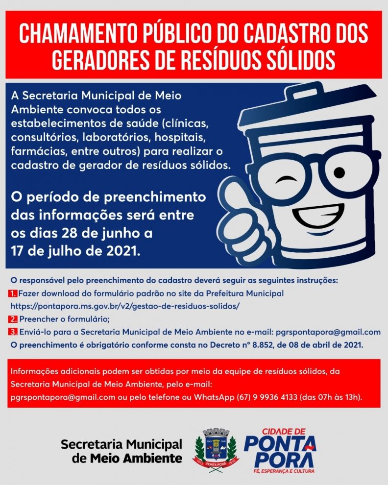 A prefeitura de Ponta Porã por meio da Secretaria Municipal de Meio Ambiente, convoca todos os estabelecimentos de saúde a realizarem o cadastro de gerador de resíduos sólidos.