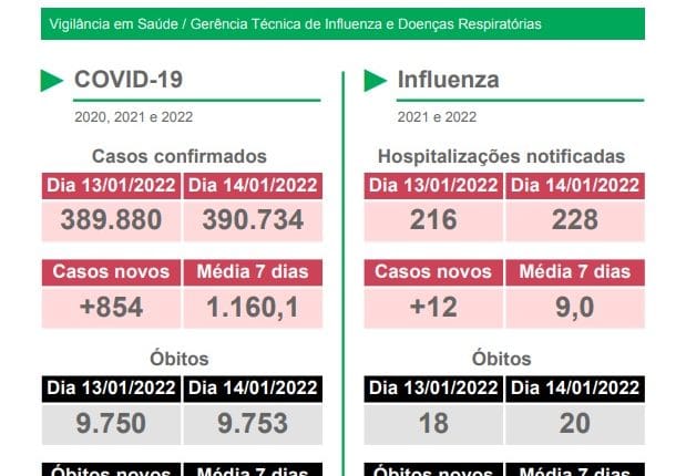 Mato Grosso do Sul confirmou entre ontem (13), e esta sexta-feira (14), 854 novos casos de Covid-19, totalizando 390.734 registros positivos da doença desde o início da pandemia.