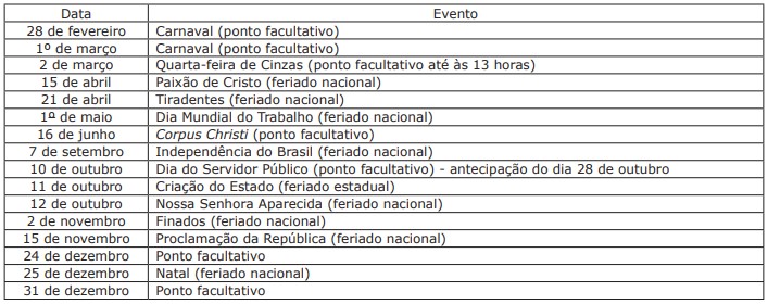 Ainda conforme o documento, os feriados instituídos pelos municípios deverão ser observados pelas instituições do Poder Executivo Estadual nas respectivas localidades, como no caso do aniversário das cidades, mas os pontos facultativos estabelecidos em decretos municipais e federais não vão valer para os órgãos das administração direta e indireta do Estado.