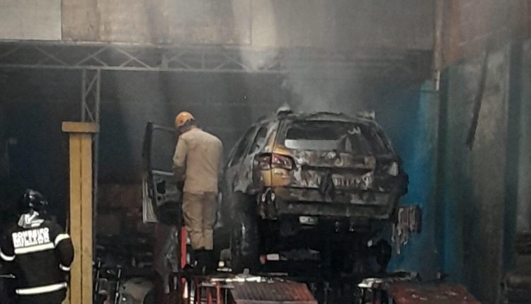 Um veículo foi totalmente destruído pelas chamas em um incêndio no começo da tarde desta terça-feira (20), em uma empresa de alinhamento e balanceamento na Linha Internacional em Ponta Porã.