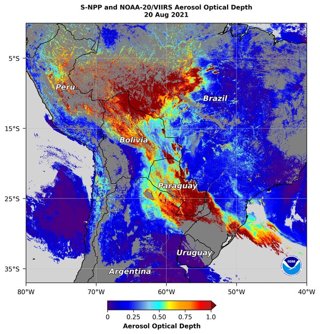 O Grupo Amigos da Astronomia acompanhou por meio da imagem de satélite GOES 16 que registrou densa fumaça de queimadas avançado pelo interior da América do Sul Brasil, Bolívia, Paraguai e Nordeste da Argentina que contribuíram para essa mudança no aspecto da Lua.