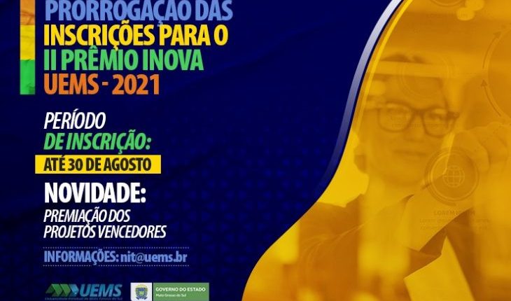 A segunda edição do Prêmio Inova-UEMS prorrogou o prazo para inscrições de propostas até o dia 30 de agosto de 2021. O Edital de prorrogação foi publicado no Diário Oficial do Estado (DOE).