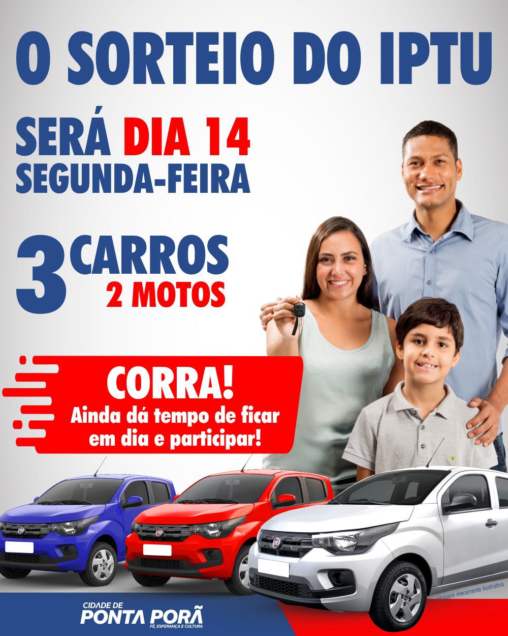 A Prefeitura de Ponta Porã fará o sorteio do IPTU Premiado 2020 na próxima segunda-feira dia 14, às 10 horas da manhã no Paço Municipal. Serão três carros 0 km e duas motos também zero quilômetro.