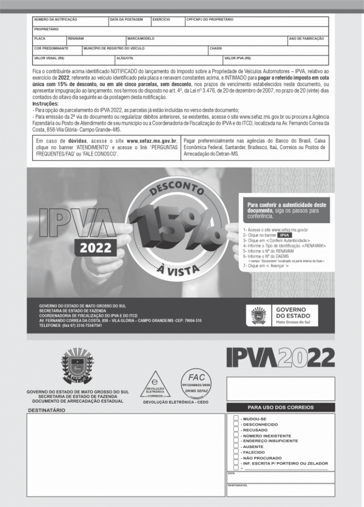 A Notificação do IPVA 2022, recebida pelo contribuinte pelos Correios, tem um único modelo.