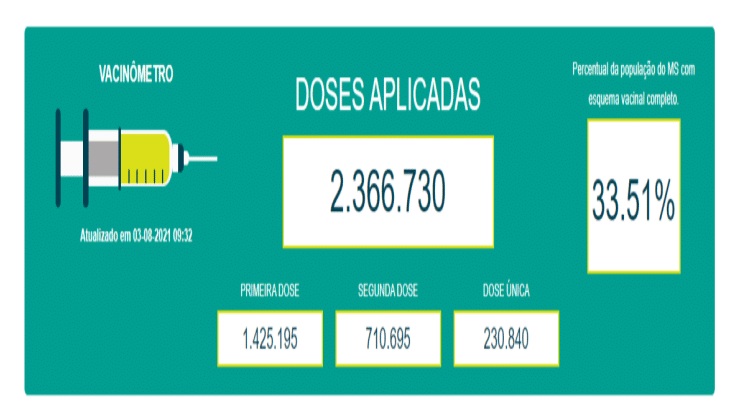 Já quanto a vacinação, Mato Grosso do Sul aplicou até o momento 2.366.730 doses, sendo 1.425.195 com a primeira dose, 710.695 com a segunda dose e 230.840 com dose única. E o percentual de sul-mato-grossense com esquema vacinal completo é de 33,51%.