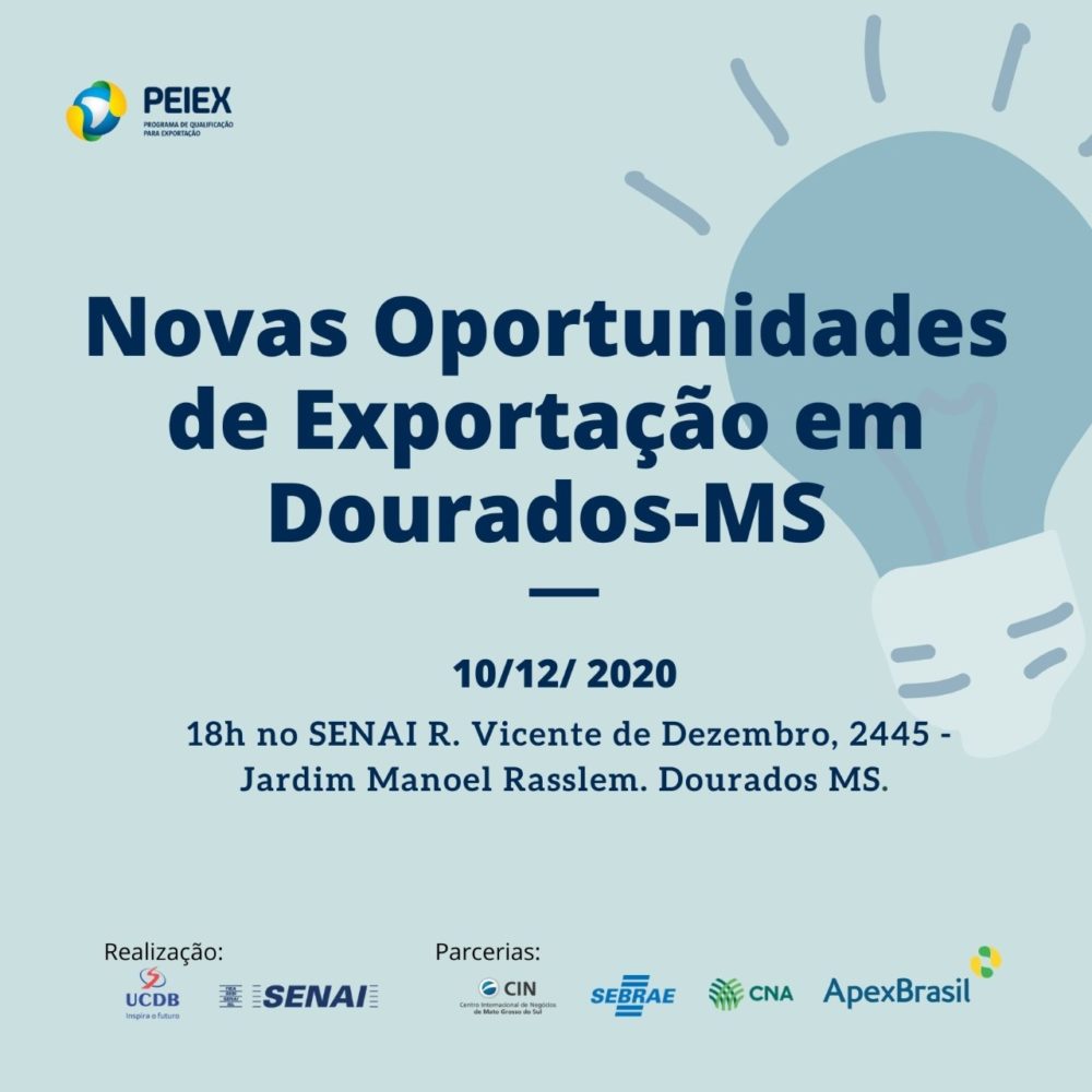 Pensando nisso o PEIEX MS juntamente com a Universidade Católica Dom Bosco (UCDB) e o SENAI de Dourados e demais parceiros CIN, SEBRAE, Agro.Br, CNA e APEX-BRASIL, oferece no dia 10 (quinta-feira) um encontro onde irão proporcionar conhecimentos sobre o passo a passo para exportação de forma planejada e segura, conteúdos como: formação de preço, incentivos fiscais e inteligência de mercado e visitas às empresas e empresários de Dourados e Região interessados em realizar exportações, abrangendo leque de visões e oportunidades.