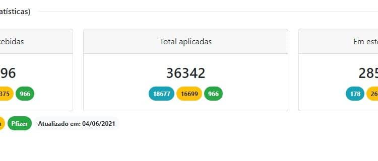Do total de imunizantes já aplicados, 18.677 são da Coronavac, 16.699 Astrazeneca e 966 Pfizer.