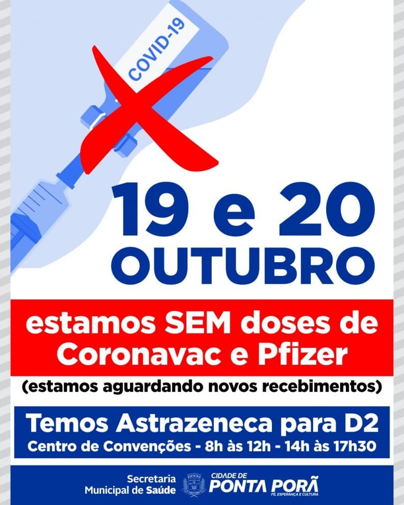 A prefeitura de Ponta Porã informou nesta terça-feira (19), que a vacinação contra a Covid-19 por meio dos imunizantes da Pfizer e Coronavac, estão suspensas por falta de doses.