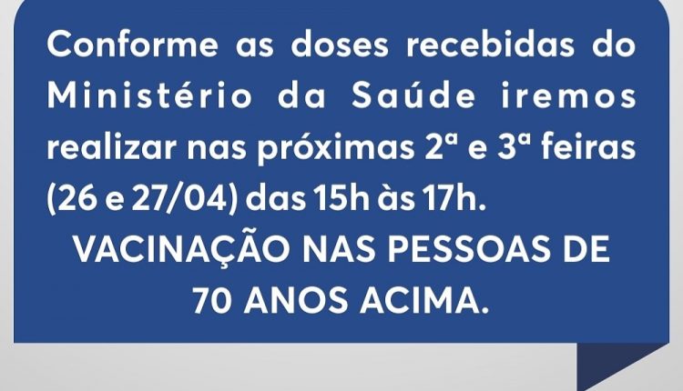 Segundo cronograma da prefeitura, que o Ponta Porã News teve acesso, o horário da vacinação é das 15h às 17h, para idosos com mais de 70 anos.