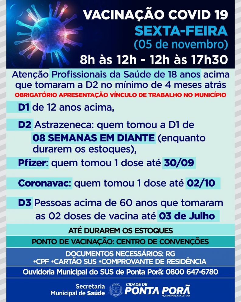Nesta sexta-feira (5), tem aplicação das doses 1, 2 e 3 de vacinas contra a Covid-19, em Ponta Porã, até às 17h30, no Centro de Convenções.