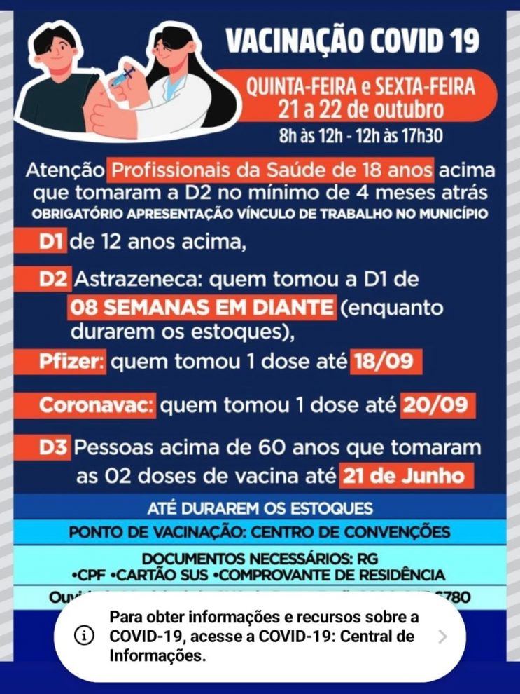 Tem também a imunização com a D3 (Dose 3) para trabalhadores da saúde, com mais de 18 anos, que tenham completado o esquema vacinal há quatro meses.