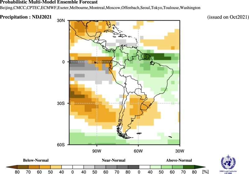 Desse modo, será o segundo verão consecutivo que o Brasil sentirá os impactos do fenômeno climático. “Condições do La Niña se desenvolveram e devem continuar com 87% de chance do La Niña de dezembro de 2021 a fevereiro de 2022”, diz trecho da publicação oficial.