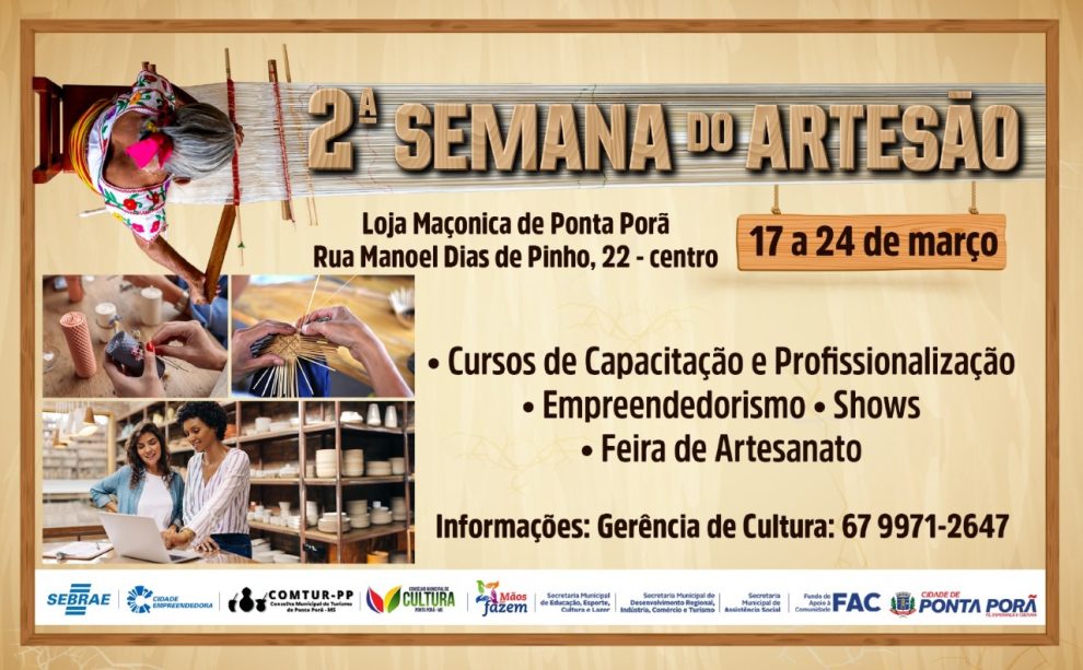 A prefeitura de Ponta Porã, através da Fundação de Cultura, Esporte e Lazer, prepara uma programação especial para II Semana do Artesão, que acontece de 17 a 24 de março, com atividades que envolverão de forma integrada as Secretarias de Educação, Esporte, Cultura e Lazer, Gerência de Cultura, Secretaria Municipal de Assistência Social e Secretaria Municipal de Desenvolvimento Regional, Indústria, Comércio e Turismo e apoio do Conselho Municipal de Cultura.
