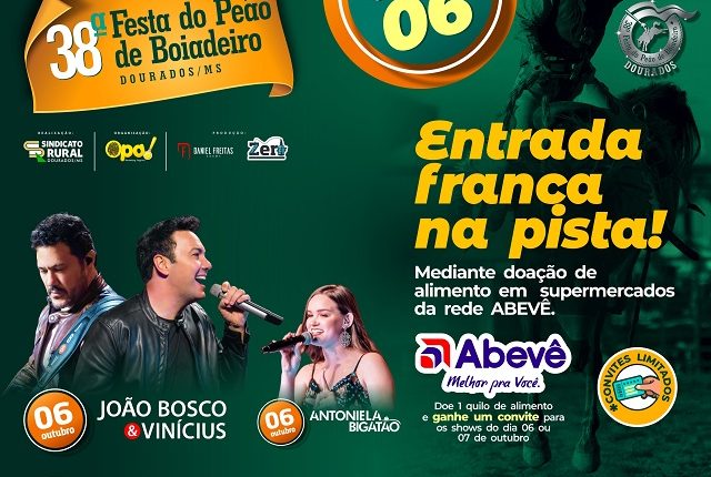 Começa nesta quinta-feira (6), a maratona de rodeios e shows da 38ª Festa do Peão de Boiadeiro de Dourados, no Parque de Exposições João Humberto de Andrade Carvalho, com show nacional da dupla João Bosco&Vinícius, e em seguida, da Antoniela Bigatão.
