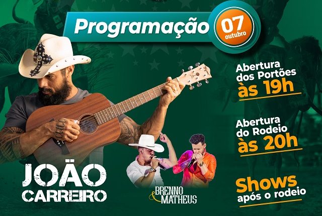 O cantor João Carreiro e a dupla Brenno&Matheus se apresentam nesta sexta-feira (7), na 38ª Festa do Peão de Boiadeiro de Dourados, no Parque de Exposições João Humberto de Andrade Carvalho, após o rodeio.