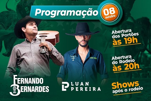 Luan Pereira, o mais novo fenômeno da música sertaneja, e Fernando Bernardes, conhecido por suas músicas country, se apresentam neste sábado (8), no Parque de Exposições João Humberto de Andrade Carvalho – penúltimo dia da 38ª Festa do Peão de Boiadeiro de Dourados, após o rodeio.