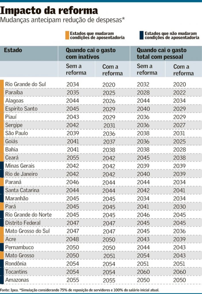 Estudo preliminar do Ipea (Instituto de Pesquisa Econômica Aplicada) revela que com as mudanças nas condições de aposentadoria a despesa com pessoal no Estado vai chegar em 2036 a valores abaixo dos de 2019 em termos reais (descontada a inflação). Sem essas alterações, isso só aconteceria nove anos depois: em 2045.
