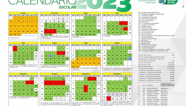 A SED (Secretaria de Estado de Educação) divulgou nesta terça-feira (24), no Diário Oficial Estadual, a Resolução/SED n° 4.144, que aprova o Calendário Escolar do ano letivo de 2023, a ser operacionalizado nas unidades escolares da REE-MS (Rede Estadual de Ensino de Mato Grosso do Sul) em todo o Estado.