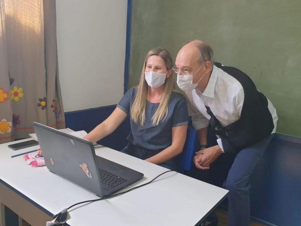 Prefeito Hélio Peluffo participa de aula remota com alunos. (Foto: Assessoria)