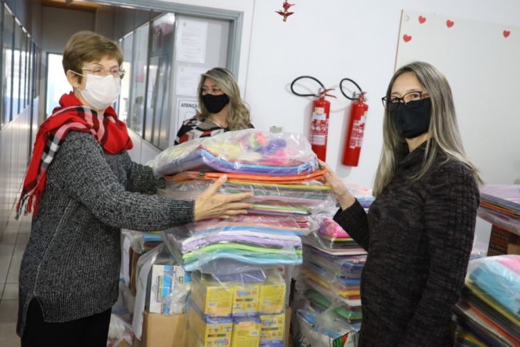 O kit escolar entregue hoje estão cola, lápis, cartolina, cadernos e outros materiais essenciais no dia a dia da vida estudantil.