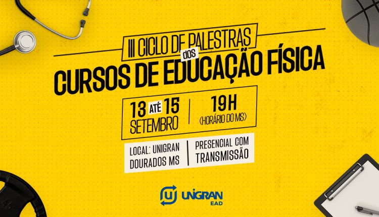 De 13 a 15 de setembro, os cursos de Educação Física da UNIGRAN irão realizar a terceira edição do Ciclo de Palestras dos Cursos de Educação Física: Saúde em Movimento, com programação presencial e on-line e que reúne grandes profissionais da área.