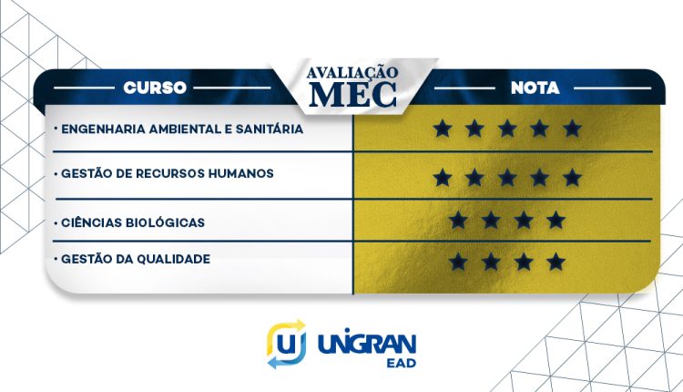 A excelência de ensino da Unigran EAD se confirma novamente. O Ministério da Educação realizou a publicação do resultado da avaliação de mais quatro cursos da Unigran EAD avaliados neste primeiro semestre de 2023, sendo conferidas duas notas 4, que qualificam os cursos como ótimos, e duas notas 5, que certificam a máxima excelência das graduações da instituição.