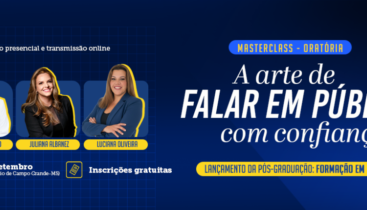A UNIGRAN realiza, na próxima segunda-feira, dia 29, às 19h, no Anfiteatro do Bloco 10, a Masterclass ‘Oratória: a arte de falar em público com confiança’. O evento é gratuito, aberto à comunidade acadêmica e ao público em geral, e contará com transmissão on-line para participantes da Europa.