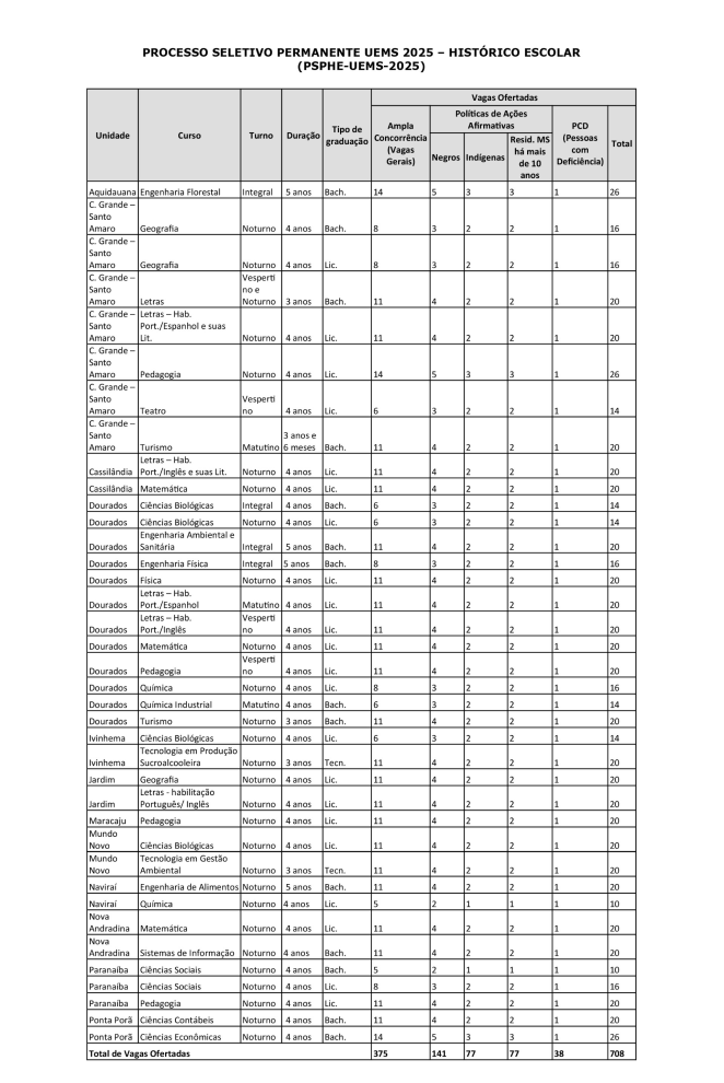 A Universidade Estadual de Mato Grosso do Sul (UEMS) está com inscrições abertas para 708 vagas em 38 cursos pelo Processo Seletivo Permanente UEMS 2025 – Histórico Escolar do Ensino Médio. As inscrições serão realizadas exclusivamente pela Internet, entre as 9h do dia 23 de setembro de 2024 e as 23h59 do dia 15 de janeiro de 2025 (horário oficial de Mato Grosso do Sul).