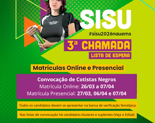 A Universidade Estadual de Mato Grosso do Sul (UEMS) publicou o Edital nº 011/2026/DRA com a 3ª Chamada de convocação de candidatos(as) da lista de espera do Sistema de Seleção Unificada (SiSU 2026) para as vagas destinadas a negros (pretos e pardos) para a participação em banca de verificação fenotípica e a realização de matrícula.