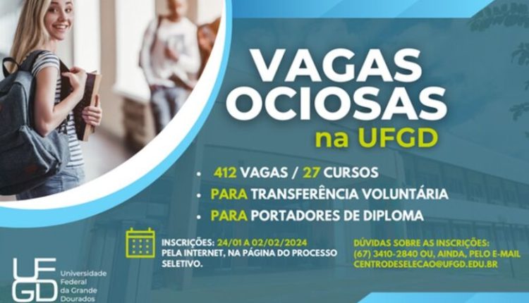 Pessoas que já cursaram ou estão cursando a faculdade têm a chance de se tornarem estudantes da UFGD (Universidade Federal da Grande Dourados) por meio do Processo Seletivo para Preenchimento de Vagas Ociosas por Transferência Voluntária e para Portadores de Diploma em 2024 (PSPVO-2024.1/UFGD). O processo oferece 412 vagas em cursos superiores de graduação, com ingresso já no primeiro semestre de 2024.