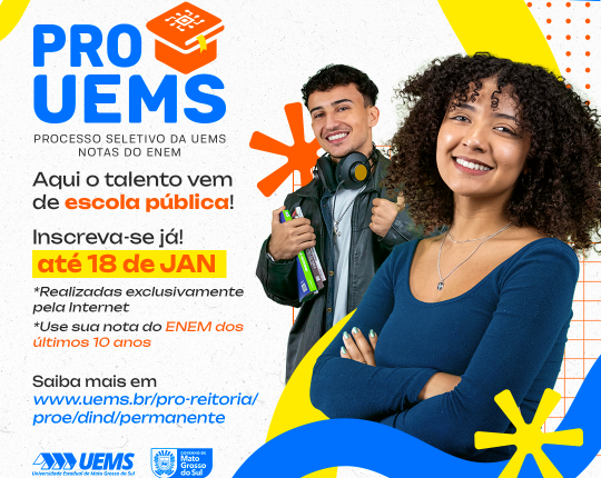 Faltam dez dias para o encerramento das inscrições do Processo Seletivo Permanente UEMS 2026 – Notas do Enem (PROUEMS 2026). A Universidade Estadual de Mato Grosso do Sul (UEMS) segue com prazo aberto até o dia 18 de janeiro de 2026 para ingresso em cursos de graduação por meio das notas do Exame Nacional do Ensino Médio (Enem), conforme regulamenta o Edital nº 180/2025.