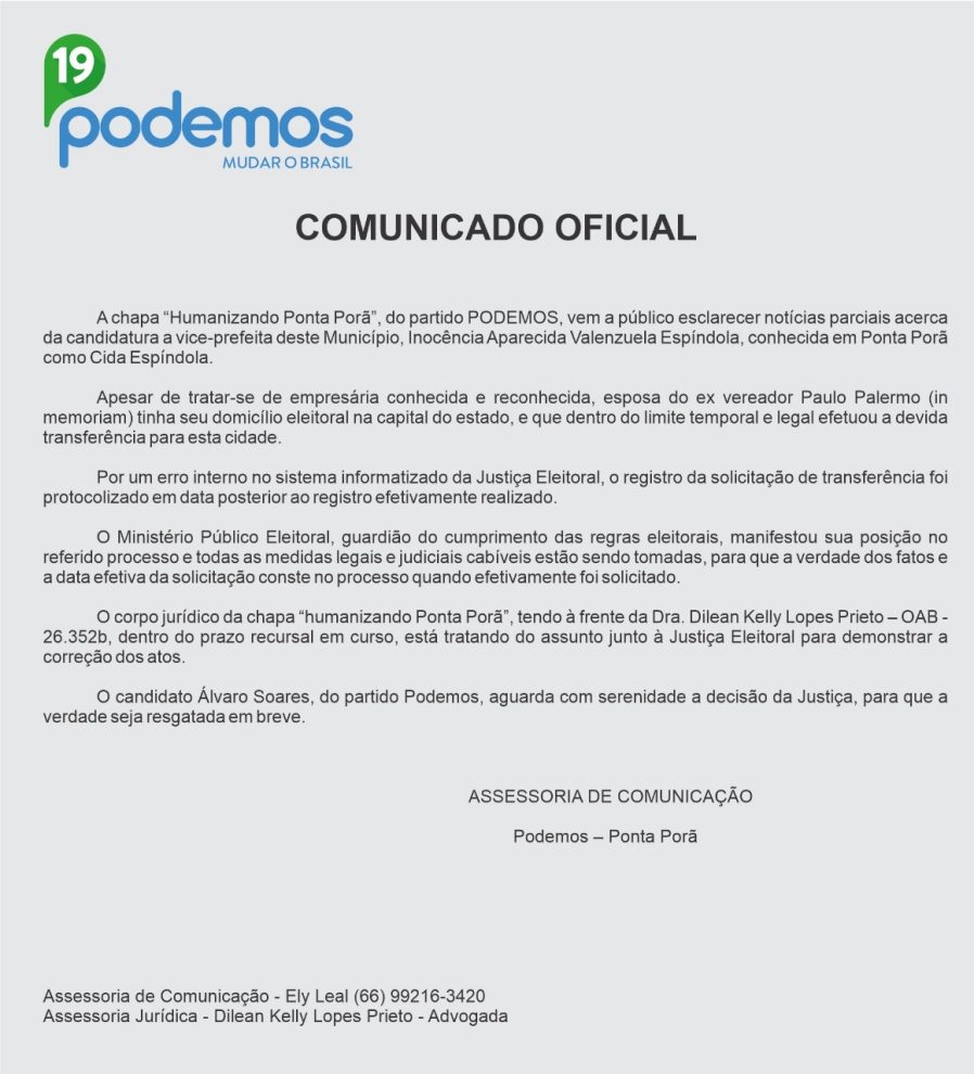 Confira, em anexo, a nota enviada pelo Podemos sobre a decisão da Justiça: