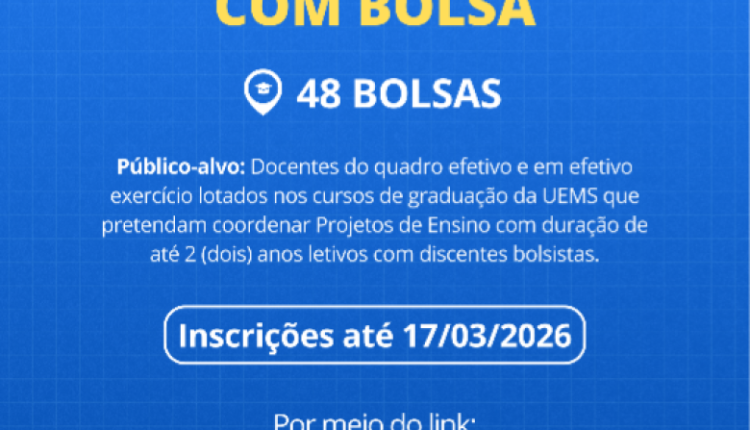 A Proe (Pró-Reitoria de Ensino) da UEMS (Universidade Estadual de Mato Grosso do Sul) publicou o Edital nº 016/2026, que regulamenta a seleção de propostas para o Programa Projeto de Ensino e a concessão de bolsas a acadêmicos da graduação.