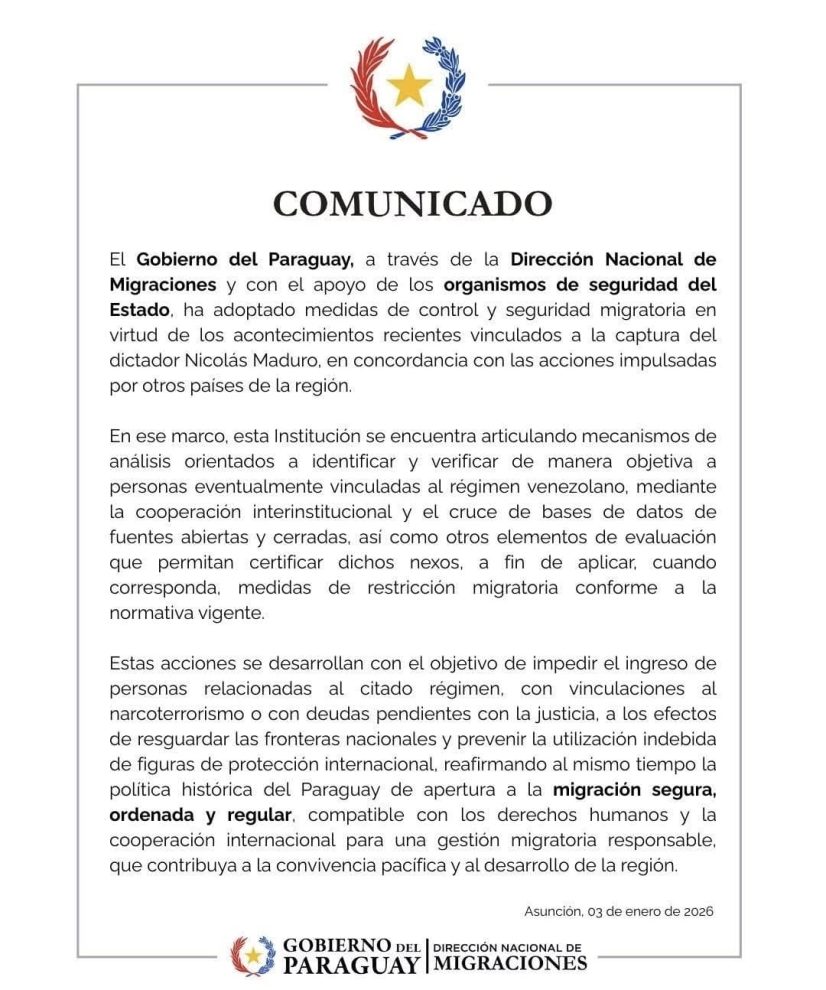 O Governo do Paraguai anunciou o reforço imediato dos controles migratórios e de segurança nas fronteiras, após os recentes acontecimentos envolvendo a captura do ex-ditador venezuelano Nicolás Maduro. A medida foi oficializada em comunicado divulgado no dia 3 de janeiro de 2026 pela Direção Nacional de Migrações (DNM).