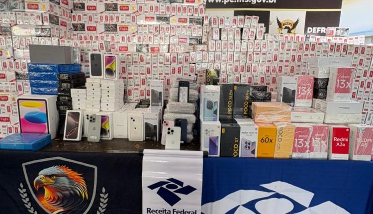 A apreensão ocorreu no âmbito da operação “Protetor e Divisas” e contou com o apoio do Grupo Regional de Vigilância e Repressão da Receita Federal. Três veículos foram interceptados transportando caixas de cigarros, aparelhos celulares de diversas marcas, incluindo Apple e Xiaomi, além de iPods, iPads e canetas de mounjaro.