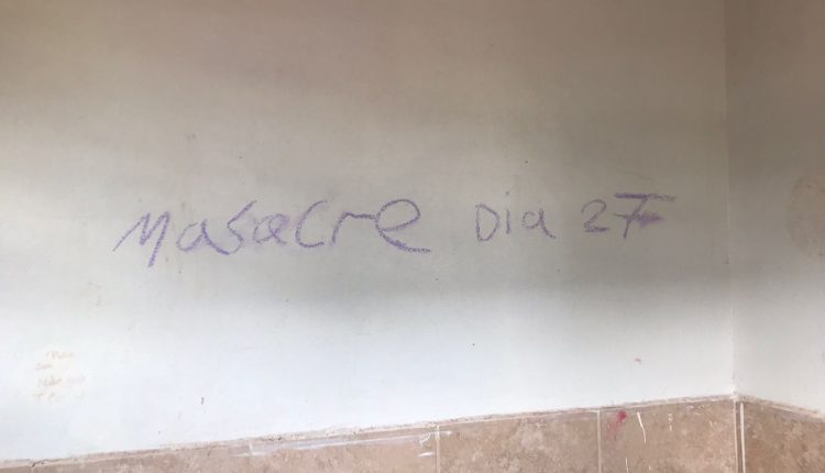 Segundo o escrito com giz de cera azul, na próxima quinta-feira (27), haveria um assassinato em massa dentro da unidade escolar. O texto diz: “27 massacre”.