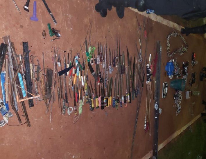 Ao todo foram apreendidos 55 chuços, 40 facas artesanais, 10 lanças, 500 gramas de maconha, 200 gramas de crack, 13 aparelhos de telefones celulares, 20 carregadores de celulares, 10 metros de fio e uma corda feita de pano conhecida como Tereza com dois metros de comprimento, além de bebida alcoólica, uma balança de precisão e um caderno com anotações.
