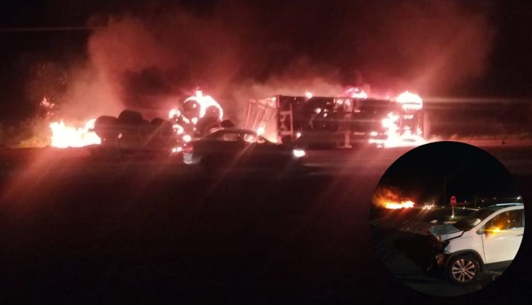 Uma carreta explodiu na BR-262, na saída de Três Lagoas, em Campo Grande, na noite de sexta-feira (3/11), tempo depois de bater um Chevrolet Tracker. O detalhe desta ocorrência é que o motorista do veículo de cargas só machucou o braço porque precisou quebrar o vidro da janela.