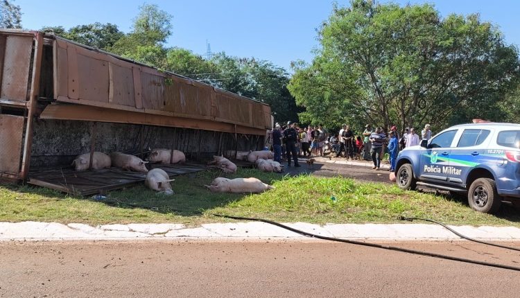 Uma carreta carregada com porcos tombou na manhã desta segunda-feira (3/6), na rotatória da Avenida Presidente Vargas com a Rua do Caiuás, na Perimetral Norte, em Dourados.