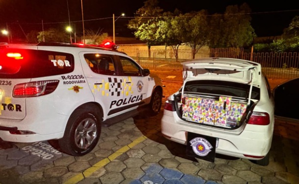 Os agentes iniciaram acompanhamento, sendo possível abordar o carro já na SP-270, Rodovia Raposo Tavares. Vistoriando o Voyage, os policiais localizaram 1.400 unidades de cigarros eletrônicos (POD) de origem estrangeira no porta-malas do veículo.