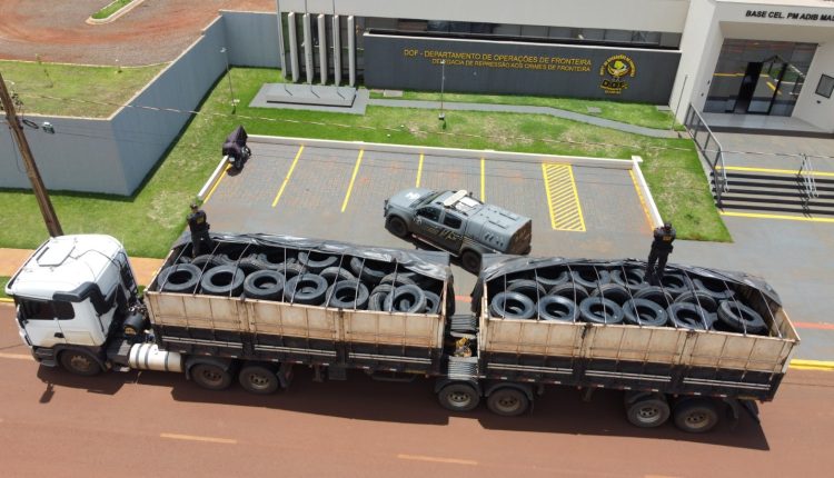 Carreta é apreendida com 200 pneus contrabandeados do Paraguai