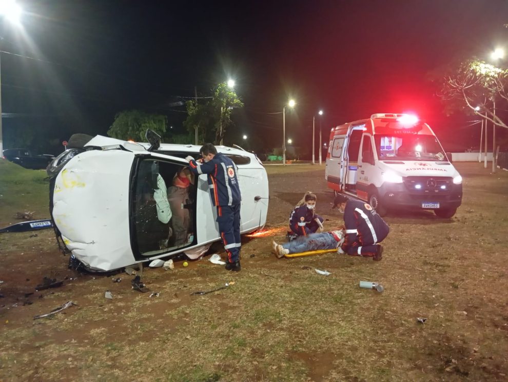 Casal ficou ferido na madrugada deste sábado (26), após acidente de trânsito na Avenida Marcelino Pires, em Dourados, próximo ao Ceper do Jardim Flórida. O veículo, um Chevrolet Onix, capotou após cruzar a via em alta velocidade e acabou colidindo contra o monumento “self point” com o nome da cidade, que ficou totalmente destruído.