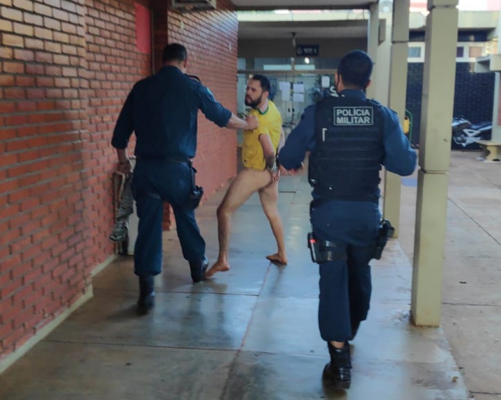 Totalmente transtornado ele passou a ofender os policiais e precisou ser contido a força e colocado na viatura e como se recusou a vestir a roupa foi levado somente de camiseta para a delegacia do 1º Distrito Policial de Dourados.